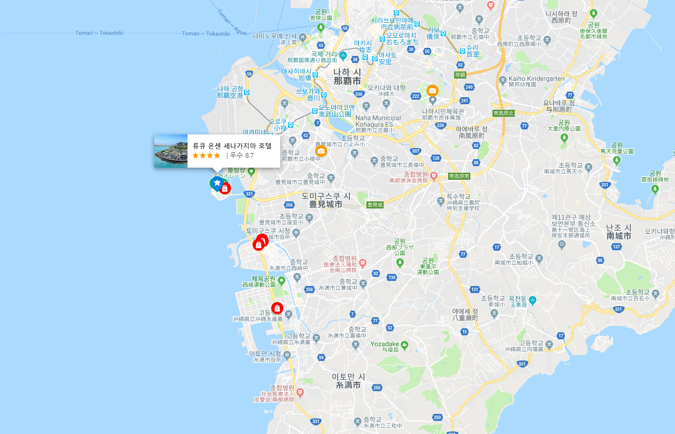류큐온센 사나가지마 호텔은 오키나와 나하공항과 가까워 차로 10분거리, 오키나와 여행의 가보면 좋은 고쿠사이도리거리, 츄라선비치는 15분거리에 있습니다.