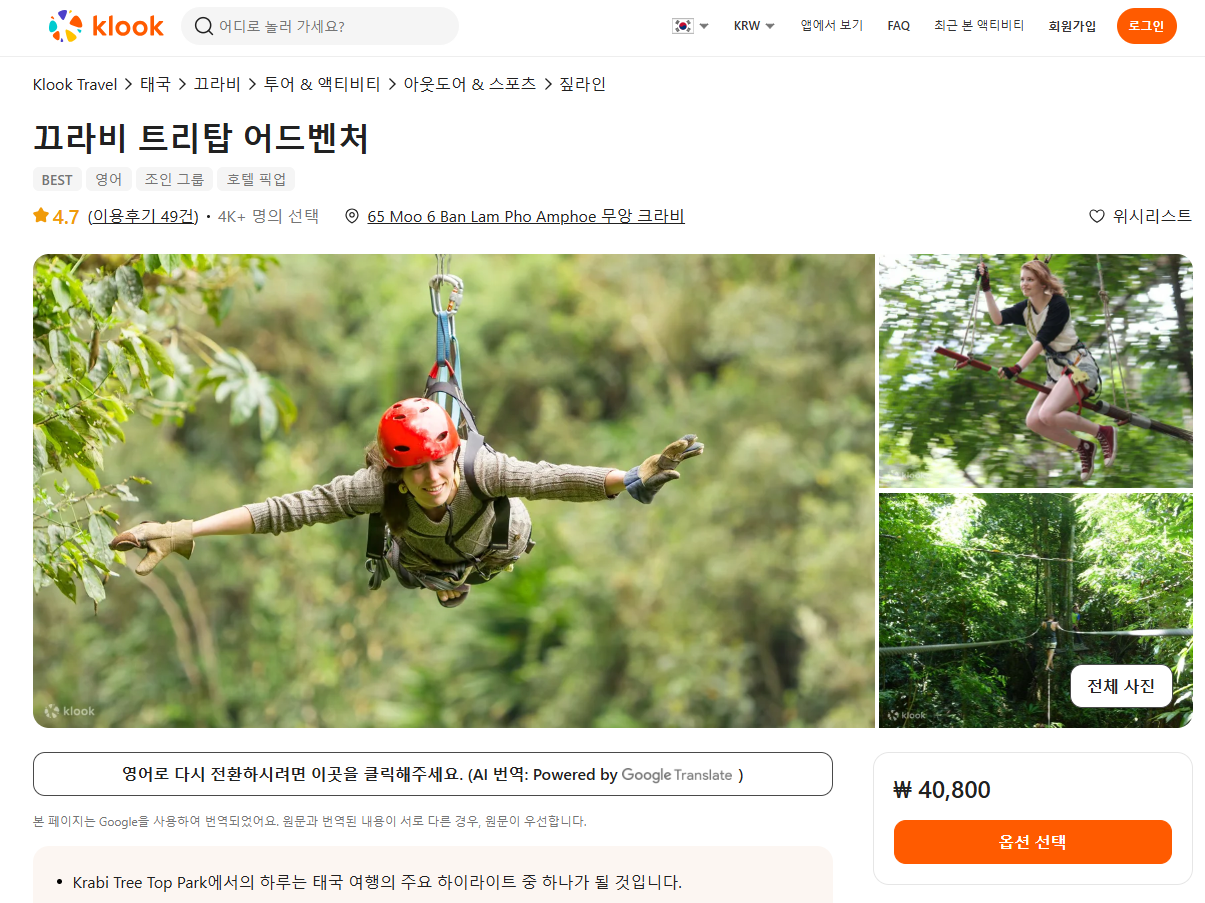 코창 트리탑 어드벤처는 클룩사이트에서 쉽게 예약하실 수 있으며, 이메일, 전화번호, 카카오톡, 네이버, 구글, 애플, 페이스복 등으로 간편하게 회원가입하고 이용하실 수 있습니다. 가격은 변동될 수 있으므로 예약시 다시 확인하고 이용하세요.