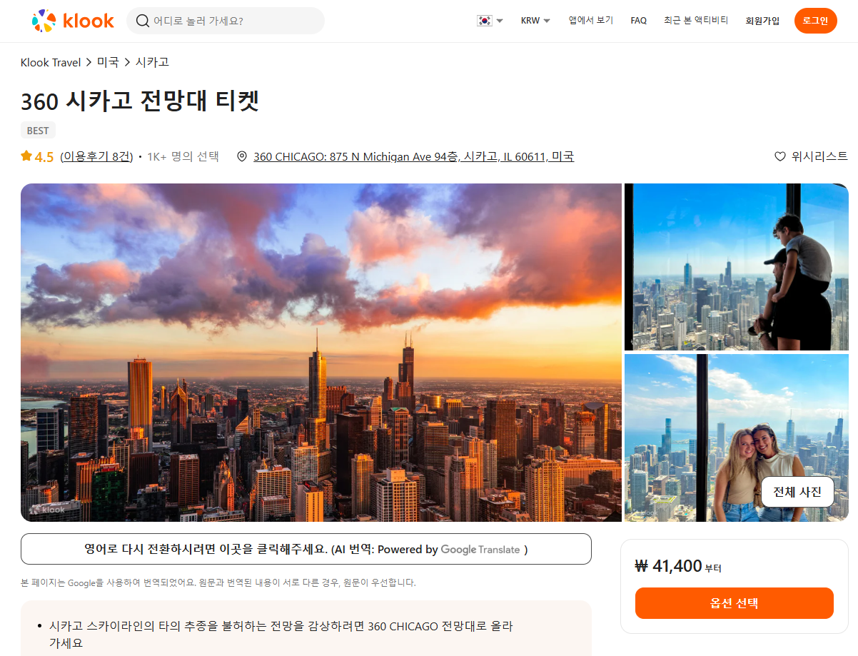 시카고 360 전망대 입장권은 클룩사이트에서 쉽게 예약하실 수 있으며, 이메일, 전화번호, 카카오톡, 네이버, 구글, 애플, 페이스복 등으로 간편하게 회원가입하고 이용하실 수 있습니다. 가격은 변동될 수 있으므로 예약시 다시 확인하고 이용하세요~