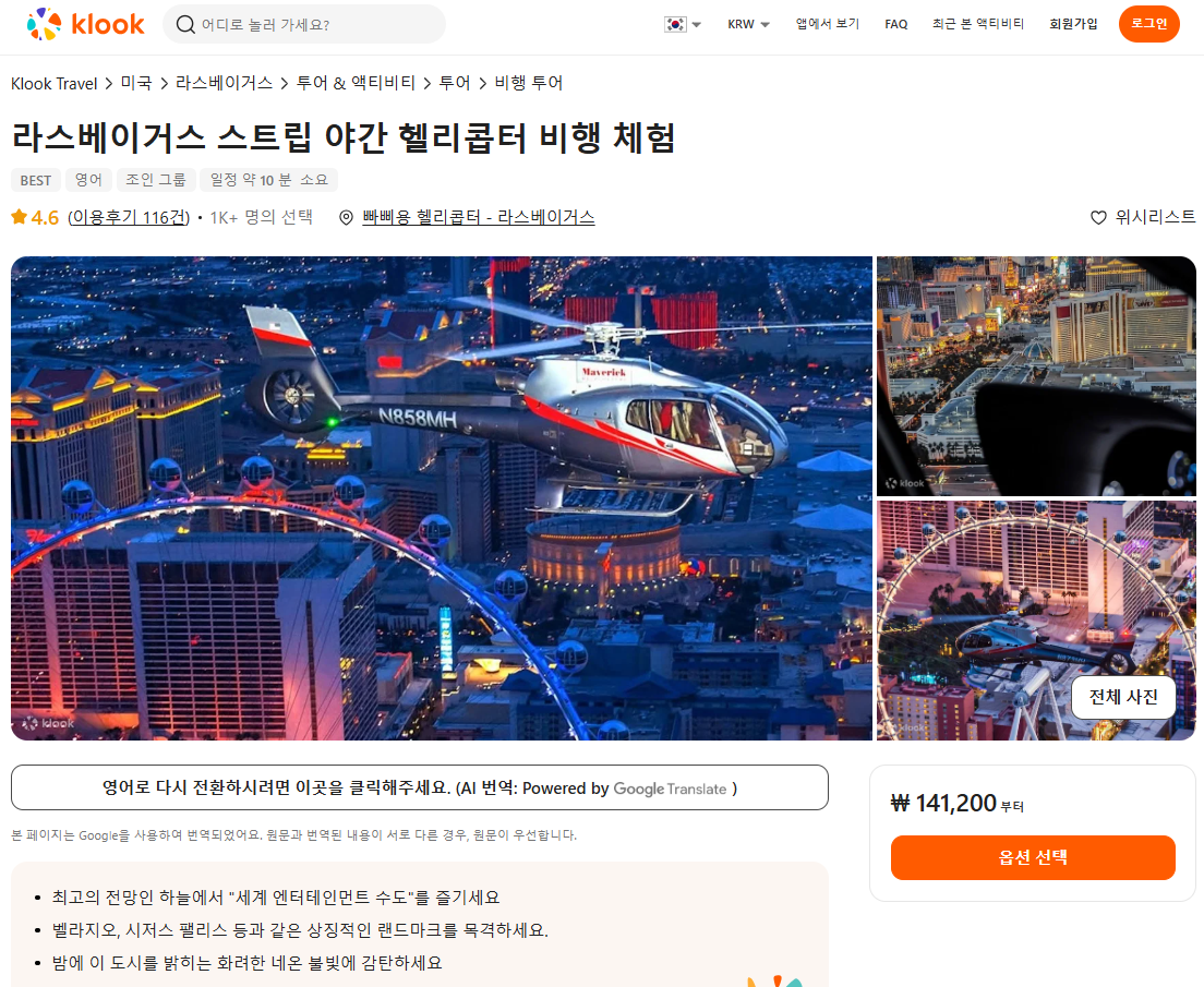 라스베가스 스트립 헬기 나이트 투어는 클룩사이트에서 쉽게 예약하실 수 있으며, 이메일, 전화번호, 카카오톡, 네이버, 구글, 애플, 페이스복 등으로 간편하게 회원가입하고 이용하실 수 있습니다. 가격은 변동될 수 있으므로 예약시 다시 확인하고 이용하세요~