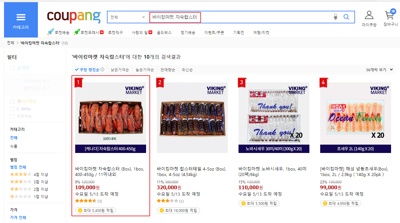 쿠팡사이트에서 바이킹마켓 자숙랍스터를 검색하시면 다양한 크기, 가격대를 비교하여