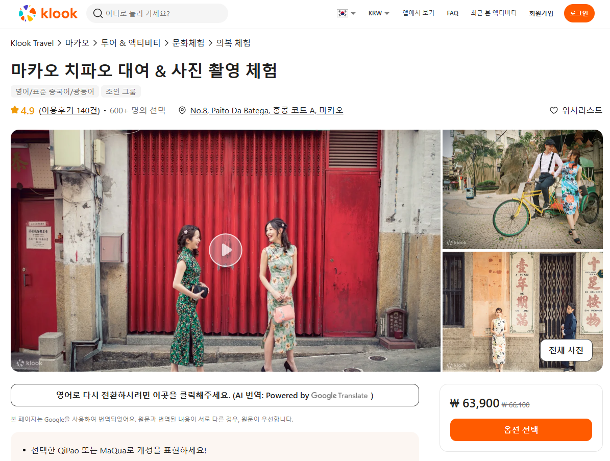 마카오 치파오 대여는 클룩사이트에서 쉽게 예약하실 수 있으며, 이메일, 전화번호, 카카오톡, 네이버, 구글, 애플, 페이스복 등으로 간편하게 회원가입하고 이용하실 수 있습니다. 가격은 변동될 수 있으므로 예약시 다시 확인하고 이용하세요~