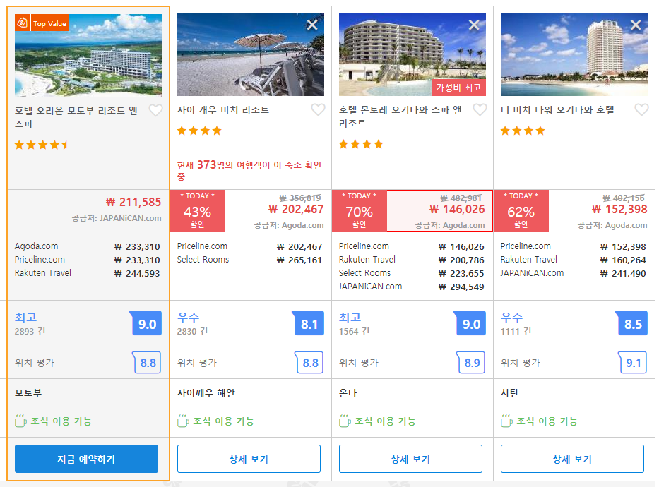 오리온 모토부 리조트 앤 스파의 최저 가격대는 아고다에서 할인특가 가격으로 매일매일 변동되며 20만원대부터 다양하게 형성됩니다. 아고다 최저가를 확인하시려면 아래 링크를 누르시면 원하는 날짜의 가격대를 자세히 보실 수 있습니다.