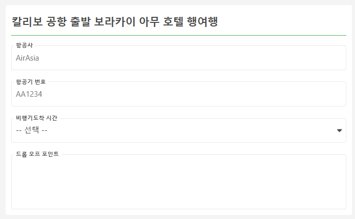 교통편 예약시에는 예약인원을 선택하고, 모바일번호, 이메일, 이름을 입력합니다. 여행 세부 정보에는 도착 항공사, 항공편 번호, 항공편 도착시간을 입력하고, 보라카이내 예약한 호텔과 주소를 입력하면 됩니다. 결제는 신용카드 또는 페이팔로 가능합니다.