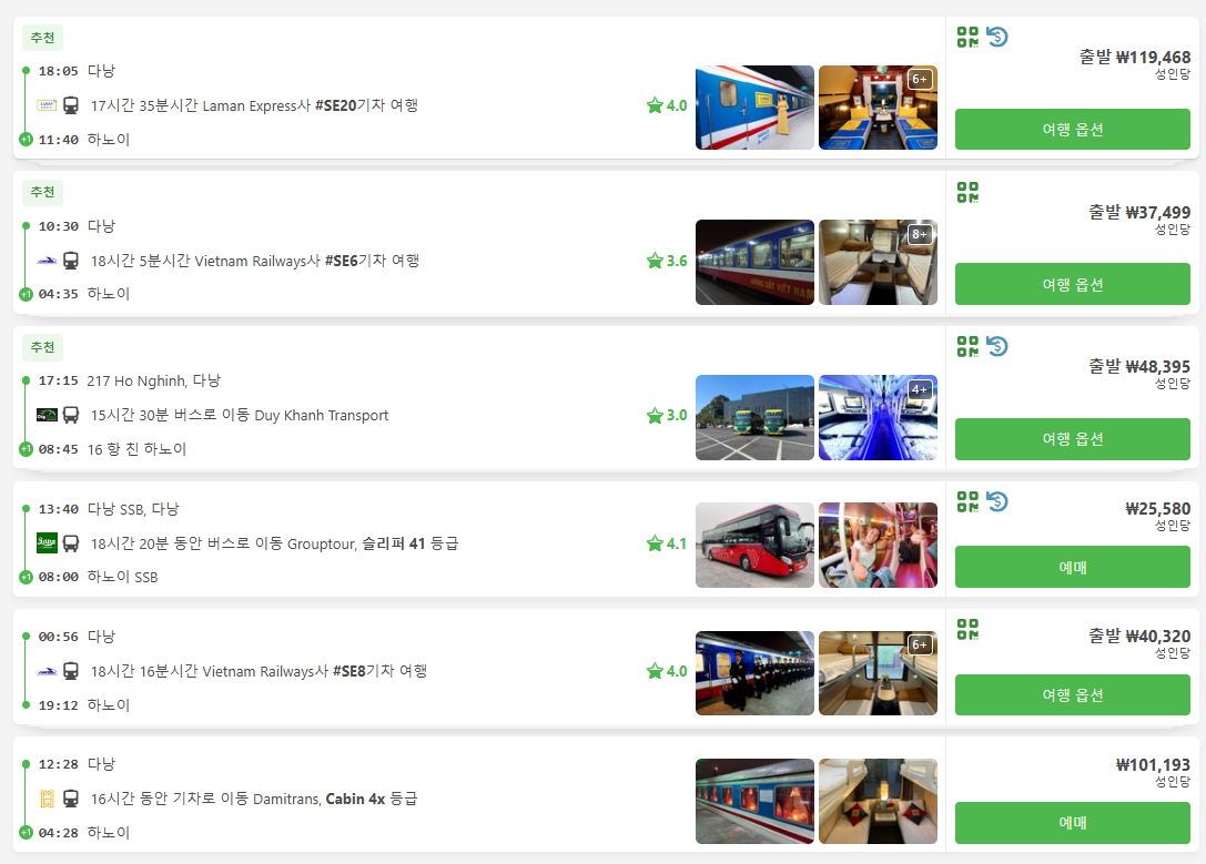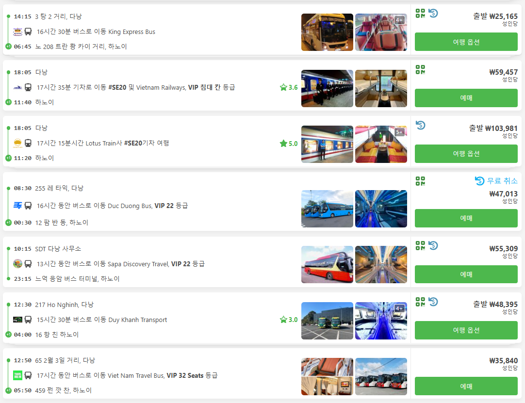 다낭에서 하노이로 이동하는 저렴한 교통편은 버스, 기차 등을 이용하실 수 있으며, 현지 온라인 예약사이트를 이용하시면 쉽고, 편하게 교통편을 검색하실 수 있고, 예약도 가능합니다.
