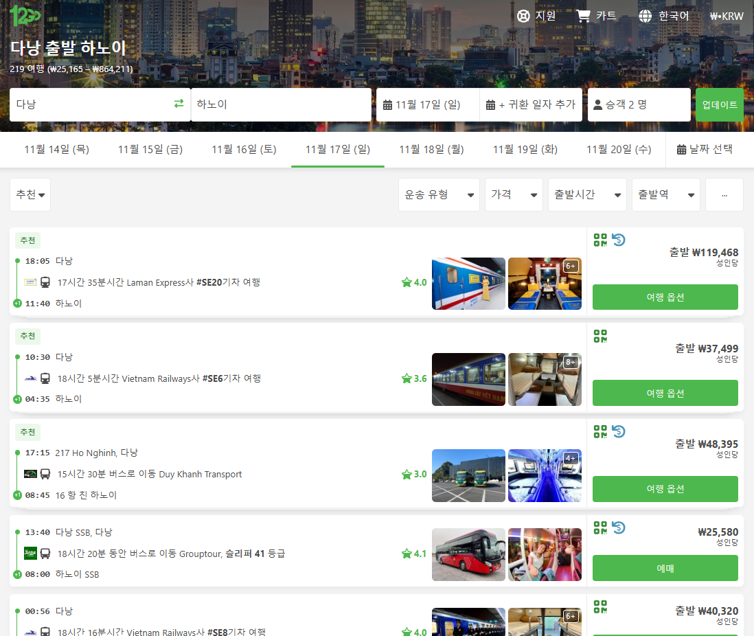 다낭에서 하노이가는 교통편 노선정보 및 예약은 12go사이트에서 예약하실 수 있으며, 이 노선 뿐만아니라 나라전역의 노선, 나라간 노선의 검색가능한 모든 교통편을 검색하고 예약하실 수 있습니다. 한국어로 검색해보시고 나오지 않으면 영어로 검색하시면 보다 쉽게 노선을 확인하실 수 있습니다.