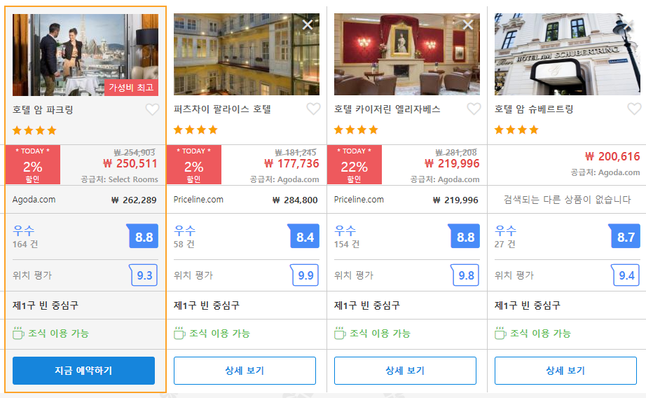 비엔나호텔 암 파크링 (Hotel Am Parkring)의 최저 가격대는 아고다에서 할인특가 가격으로 매일매일 변동되며 20만원대부터 다양하게 형성됩니다. 아고다 최저가를 확인하시려면 아래 링크를 누르시면 원하는 날짜의 가격대를 자세히 보실 수 있습니다.