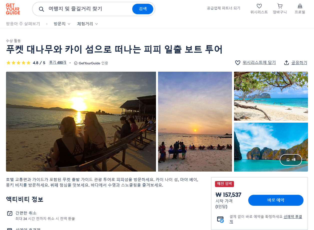 푸켓당일치기 푸켓 대나무와 카이 섬으로 떠나는 피피 일출 보트 투어는 GET YOUR GUIDE 사이트에서 예약하실 수 있습니다. 사이트는 특히 전세계 대부분의 나라, 지역의 투어, 교통편 있어, 쉽게 찾을 수 없는 여행지의 다양한 투어 및 서비스를 이용할 수 있는 글로벌 사이트입니다. 전세계 여행자들이 많이 사용하는 사이트로 한국분들이 많이 예약하는 투어를 찾으신다면 klook 여행사이트 추천합니다. 함께 사용하시면 더욱 편하게 여행하실 수 있습니다.