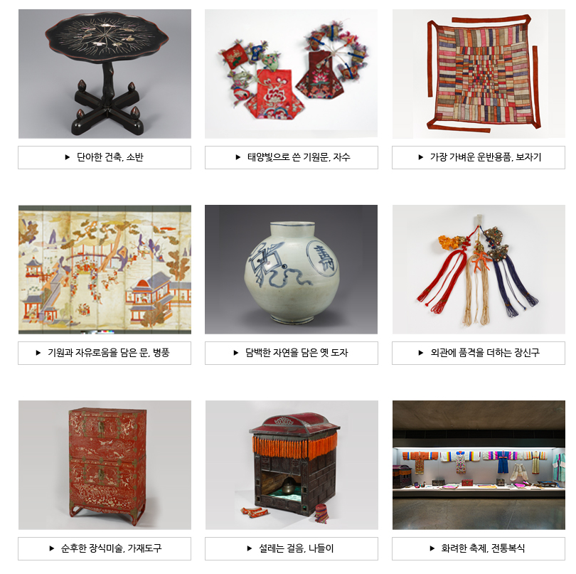 다양한 소반, 목가구, 보자기 등을 통해 화려함과 소박함, 단정함과 파격을 동시에 보여주는