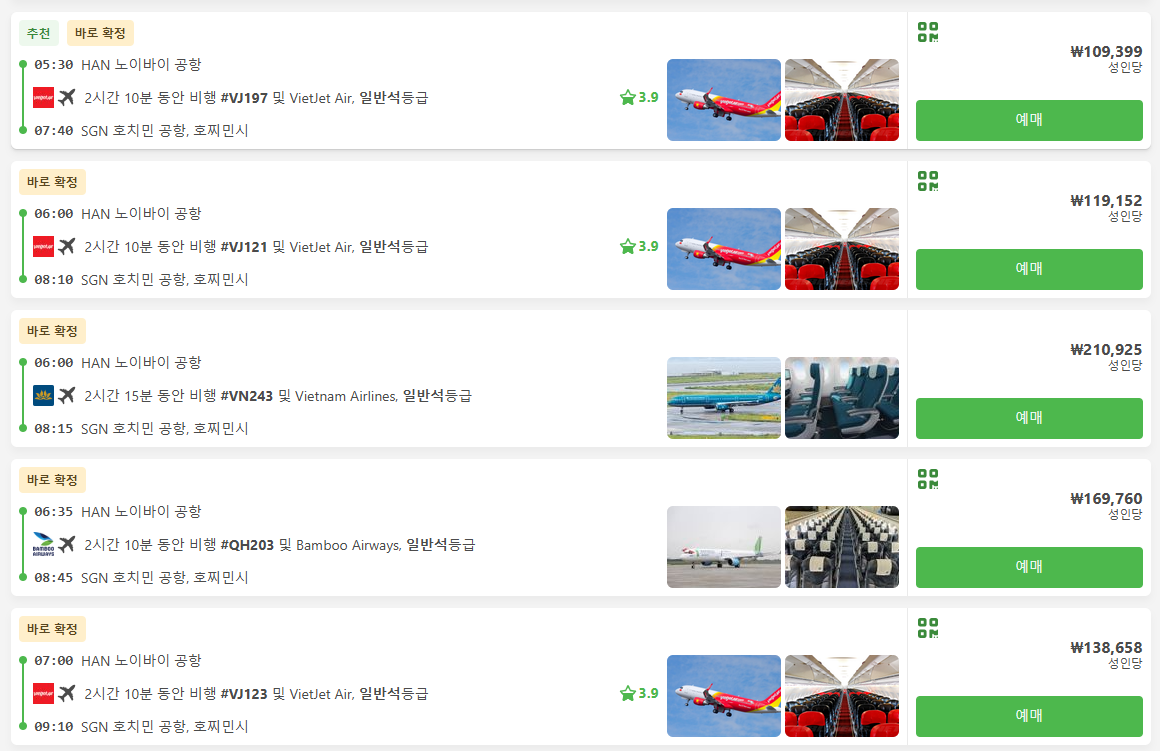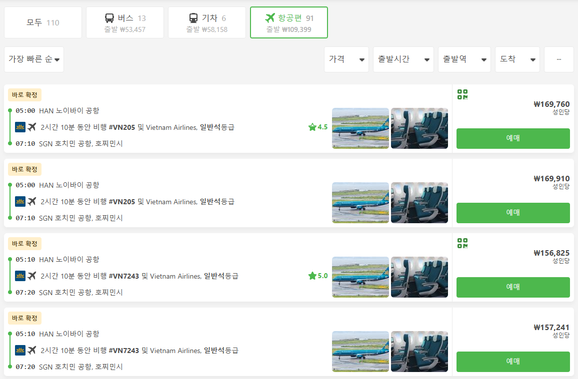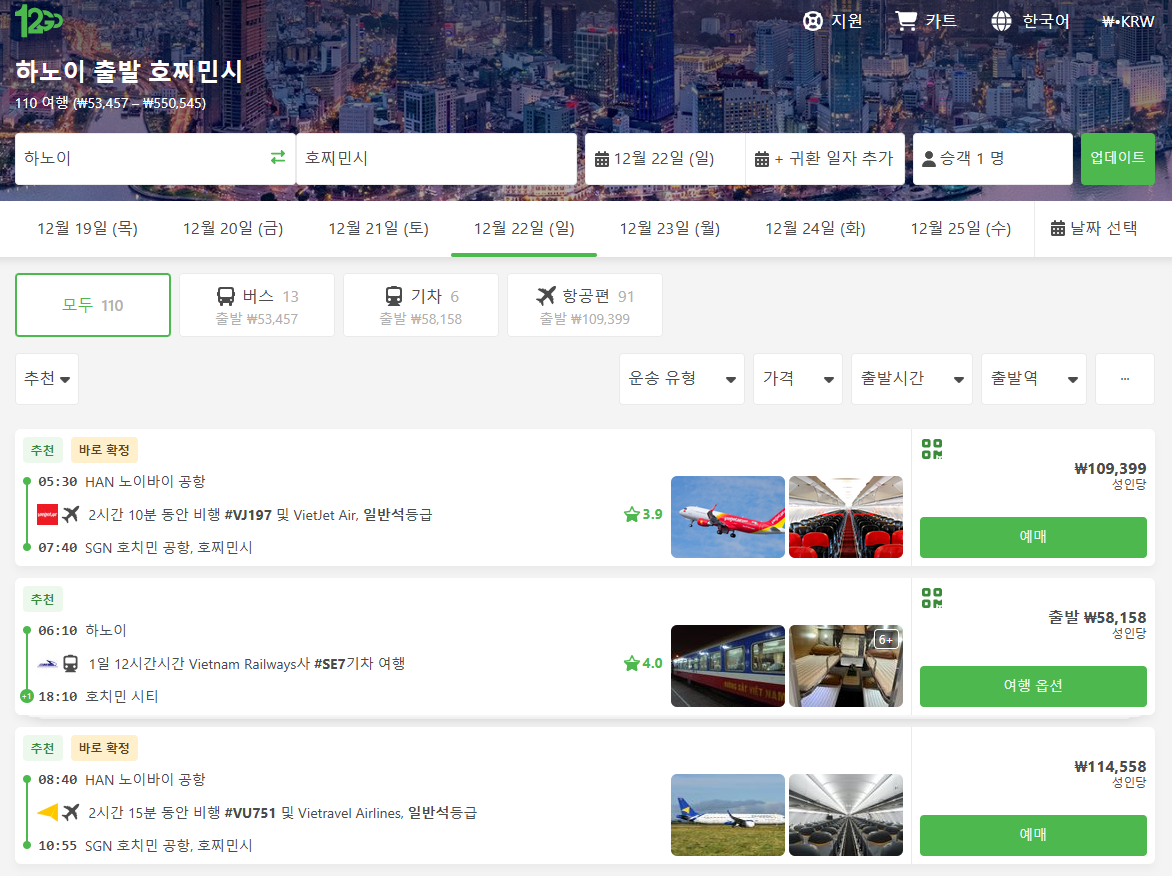하노이에에서 호치민으로 이동하는 국내선 비행기는 하노이노이바이공항에서 호치민공항으로 이동하며 2시간 10분의 짧은 이동시간이 장점이며 항공기는 제스타퍼시픽항공, 비엣젯항공, 베트남에어라인 등 다양합니다. 시간대에 따라 10만원대부터 다양하게 있습니다. 베트남 국내선 항공기를 포함한, 기차, 버스 등 모두 온라인으로 예약이 가능하며, 현지사이트인만큼 영어로 되어 있지만 이해가 쉬워 편하게 예약하실 수 있습니다.