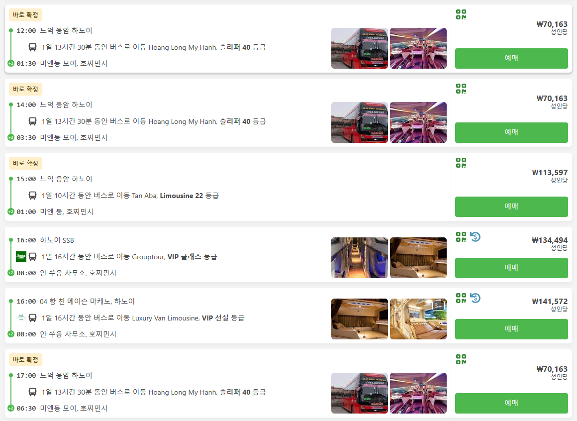 하노이에서 호치만가는 교통편 노선정보 및 예약은 12go사이트에서 예약하실 수 있으며, 이 노선 뿐만아니라 나라전역의 노선, 나라간 노선의 검색가능한 모든 교통편을 검색하고 예약하실 수 있습니다. 한국어로 검색해보시고 나오지 않으면 영어로 검색하시면 보다 쉽게 노선을 확인하실 수 있습니다.