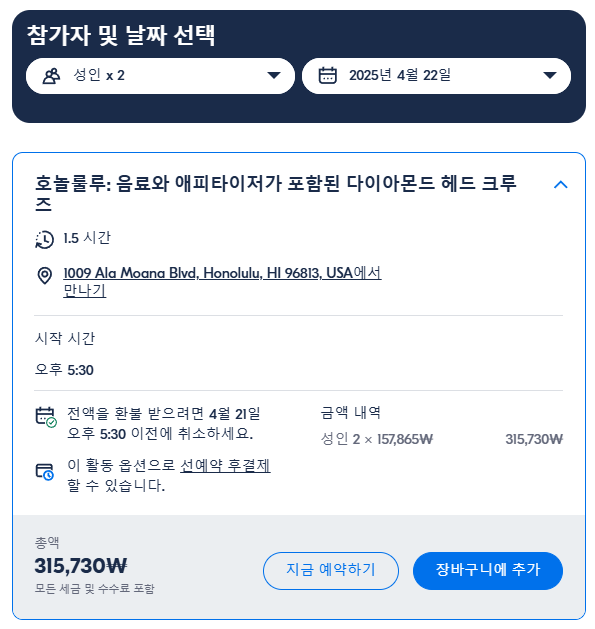 하와이 호놀룰루출발 음료와 애피타이저가 포함된 다이아몬드 헤드 크루즈는 GET YOUR GUIDE 사이트에서 예약하실 수 있습니다. 사이트는 특히 전세계 대부분의 나라, 지역의 투어, 교통편 있어, 쉽게 찾을 수 없는 여행지의 다양한 투어 및 서비스를 이용할 수 있는 글로벌 사이트입니다. 전세계 여행자들이 많이 사용하는 사이트로 한국분들이 많이 예약하는 투어를 찾으신다면 klook 여행사이트 추천합니다. 함께 사용하시면 더욱 편하게 여행하실 수 있습니다.