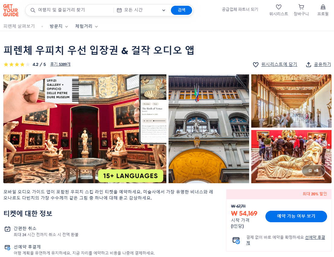피렌체 우피치 미술관 우선입장 티켓은 GET YOUR GUIDE 사이트에서 예약하실 수 있습니다. 사이트는 특히 전세계 대부분의 나라, 지역의 투어, 교통편 있어, 쉽게 찾을 수 없는 여행지의 다양한 투어 및 서비스를 이용할 수 있는 글로벌 사이트입니다. 전세계 여행자들이 많이 사용하는 사이트로 한국분들이 많이 예약하는 투어를 찾으신다면 klook 여행사이트 추천합니다. 함께 사용하시면 더욱 편하게 여행하실 수 있습니다.