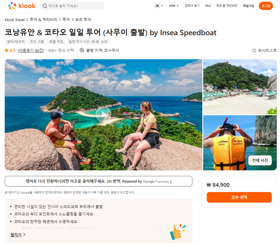 코사무이출발 코낭유안과 코타오 일일투어는 클룩사이트에서 쉽게 예약하실 수 있으며, 이메일, 전화번호, 카카오톡, 네이버, 구글, 애플, 페이스복 등으로 간편하게 회원가입하고 이용하실 수 있습니다. 가격은 변동될 수 있으므로 예약시 다시 확인하고 이용하세요~