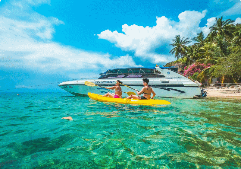 코사무이출발 코낭유안과 코타오 일일투어에 참여하시면 Insea Speedboat의 친절한 팀이 코사무이의 호텔 로비에서 직접 픽업하여 Bang Rak의 전용 부두로 모셔다 드립니다. 가이드로부터 유용한 정보를 얻고 가벼운 아침 식사를 즐긴 후 쾌속정을 타고 코낭위안으로 향합니다.
