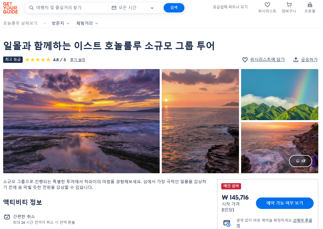 하와이 전문 사진 가이드와 함께하는 일몰 사진 투어는 GET YOUR GUIDE 사이트에서 예약하실 수 있습니다. 사이트는 특히 전세계 대부분의 나라, 지역의 투어, 교통편 있어, 쉽게 찾을 수 없는 여행지의 다양한 투어 및 서비스를 이용할 수 있는 글로벌 사이트입니다. 전세계 여행자들이 많이 사용하는 사이트로 한국분들이 많이 예약하는 투어를 찾으신다면 klook 여행사이트 추천합니다. 함께 사용하시면 더욱 편하게 여행하실 수 있습니다.