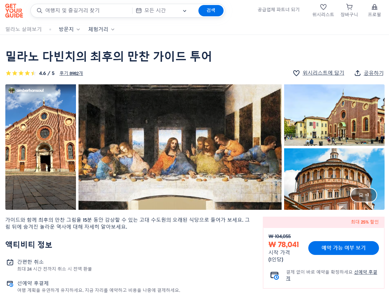 밀라노 다빈치의 최후의 만찬 가이드 투어는 GET YOUR GUIDE 사이트에서 예약하실 수 있습니다. 사이트는 특히 전세계 대부분의 나라, 지역의 투어, 교통편 있어, 쉽게 찾을 수 없는 여행지의 다양한 투어 및 서비스를 이용할 수 있는 글로벌 사이트입니다. 전세계 여행자들이 많이 사용하는 사이트로 한국분들이 많이 예약하는 투어를 찾으신다면 klook 여행사이트 추천합니다. 함께 사용하시면 더욱 편하게 여행하실 수 있습니다.