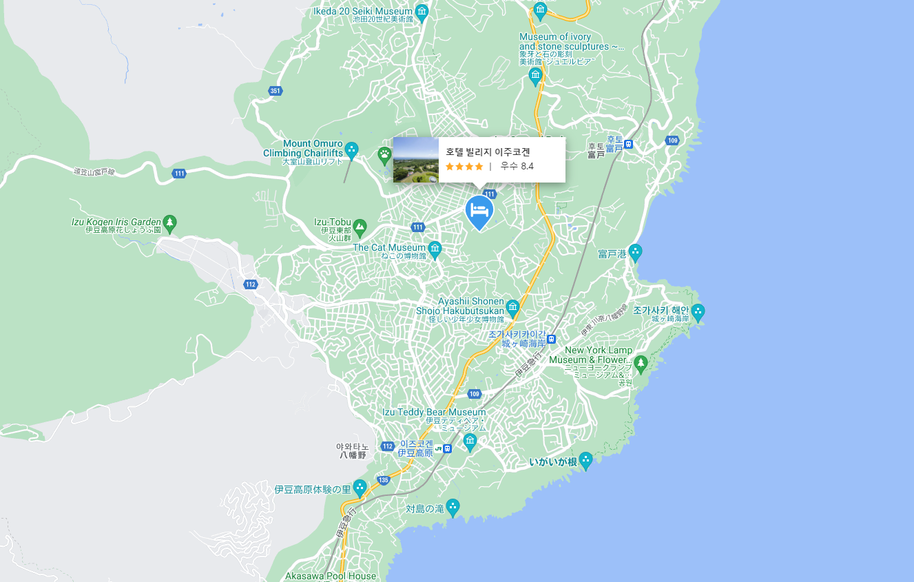도쿄에서 가까운 온천마을 아타미가 속해 있는 이즈반도는 8세기부터 번성한 오래된 온천지로 온천과 함께 예술을 감상하실 수 있는 미술관, 로프웨이, 유람선 등의 다양한 관광지로 유명한 곳입니다. 이즈반도 이주코겐역시 그러한 곳중 한곳이며 아타미에서 더 아래쪽으로 내려가면 이주코겐JR역에서 그리 멀지않은 호텔 빌리지 이주코겐(Hotel Village Izukogen)은 그러한 분위기를 물씬 느낄 수 있는 휴양지입니다.