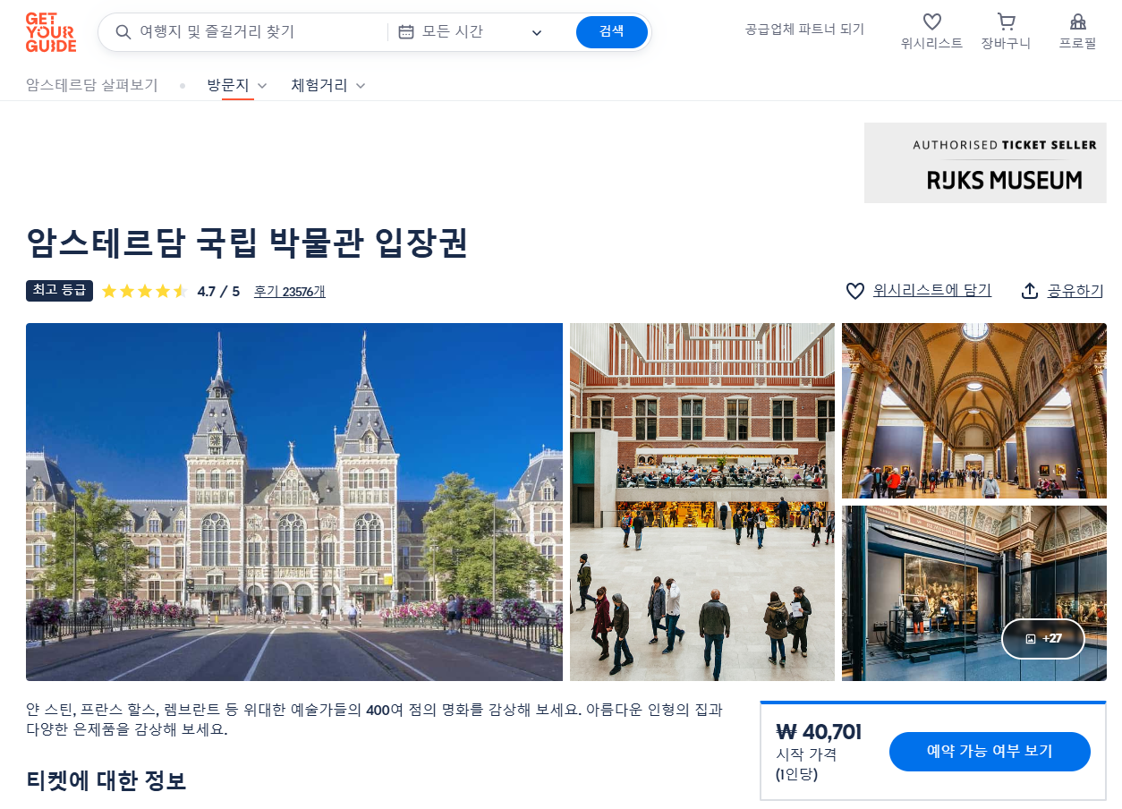 암스테르담 국립미술관 입장권은 GET YOUR GUIDE 사이트에서 예약하실 수 있습니다. 사이트는 특히 전세계 대부분의 나라, 지역의 투어, 교통편 있어, 쉽게 찾을 수 없는 여행지의 다양한 투어 및 서비스를 이용할 수 있는 글로벌 사이트입니다. 전세계 여행자들이 많이 사용하는 사이트로 한국분들이 많이 예약하는 투어를 찾으신다면 klook 여행사이트 추천합니다. 함께 사용하시면 더욱 편하게 여행하실 수 있습니다.