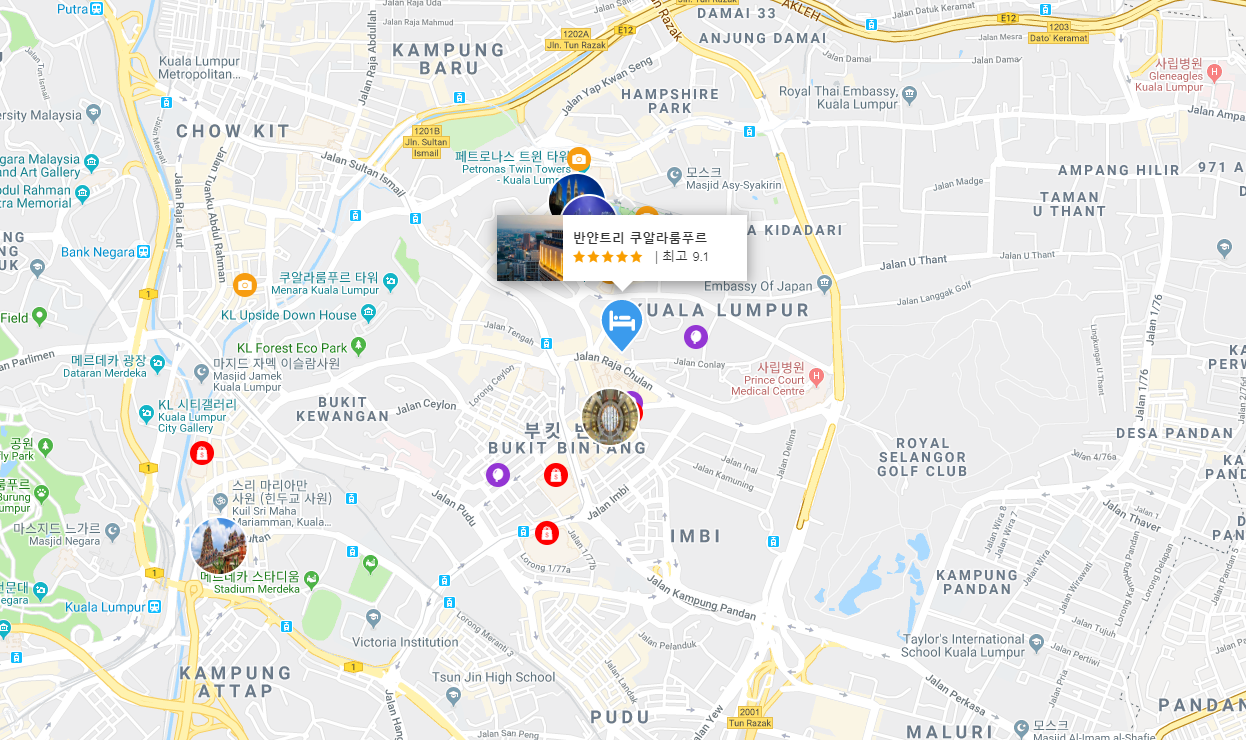 쿠알라룸푸르 번화가에 위치한 반얀트리 쿠알라룸푸르 (Banyan Tree Kuala Lumpur)는파빌리온 소핑몰과 도보로 3분거리로 접근성이 좋으며, klcc 아쿠리아림, 더월드,페런하이트 88, 페트로나스 트윈타워 등이 호텔근처에 있습니다.