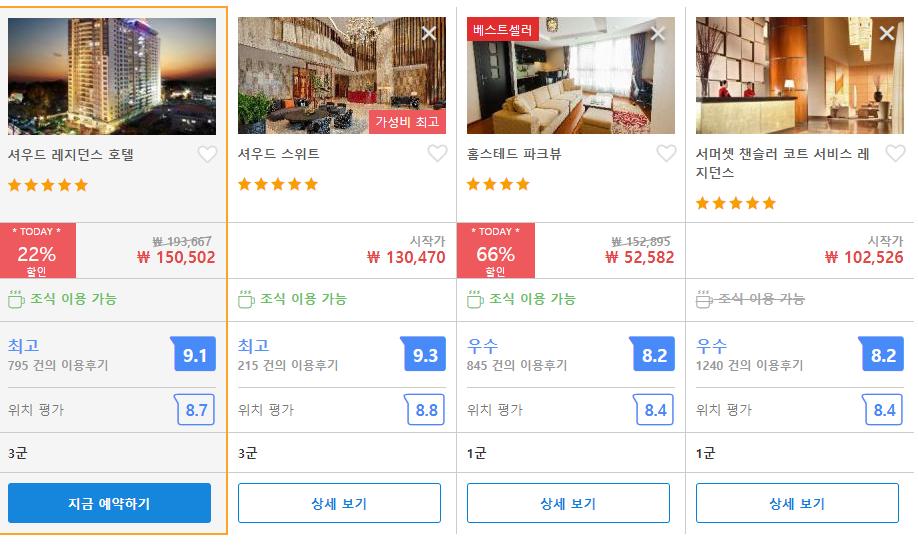 호치민 셔우드 레지던스 호텔 (Sherwood Residence Hotel)의 최저 가격대는 아고다웹사이트에서 할인특가 가격으로 매일매일 변동되며 10만원대부터 다양하게 형성됩니다. 날짜별로 매일 가격이 다르므로 아고다웹사이트 최저가를 확인하시려면 아래 링크를 누르시고 원하는 날짜의 가격대를 선택해야 정확한 가격을 자세히 보실 수 있습니다.