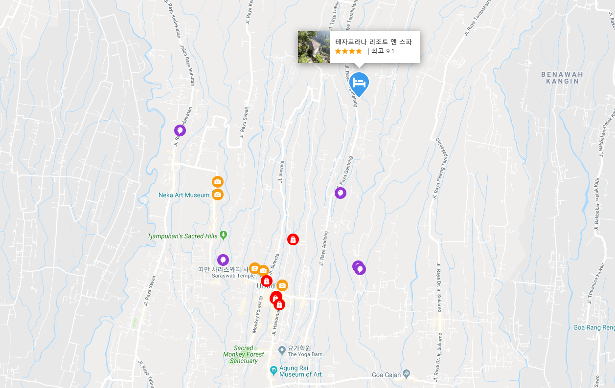 발리의 아름다운 자연환경을 온몸으로 느끼며 여유를 만끽하기 좋은 발리의 호텔자프라나 리조트 앤 스파 (Tejaprana Resort and Spa)는 발리 웅우라라이국제공항에서32.4km 거리에 있는 곳으로 우붓시내에서 조금 더 안쪽에 있어조용하게 일행과 함께 휴식을 취하기 좋은 발리리조트입니다.