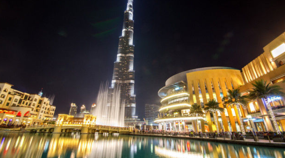 두바이 몰 분수쇼의 조명을 감상하세요