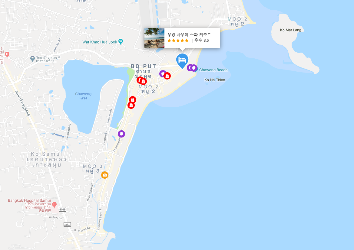 무앙 사무이 스파 리조트 (Muang Samui Spa Resort)는 코사무이 섬에서 동쪽 해안에 위치해 있으며, 차웽 해변의 하얀 백사장을 그 모습 그대로 즐길 수 있는 장소에 있습니다. 또한 사무이 국제 공항에서 3Km 떨어진 곳에 10분 정도 차량으로 이동하는 위치에 있고, 나톤 도시나 페리 항구까지 가실 때 25km정도의 거리를 가면 만나 보실 수 있습니다.