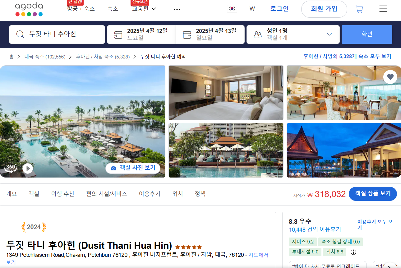 두짓타니 후아힌 호텔 (Dusit Thani Hua Hin Hotel) 의 최저 가격대는 아고다에서 할인특가 가격으로 매일매일 변동되며 10만원대부터 다양하게 형성됩니다.아고다 최저가를 확인하시려면 아래 링크를 누르시면 원하는 날짜의 가격대를 자세히 보실 수 있습니다.
