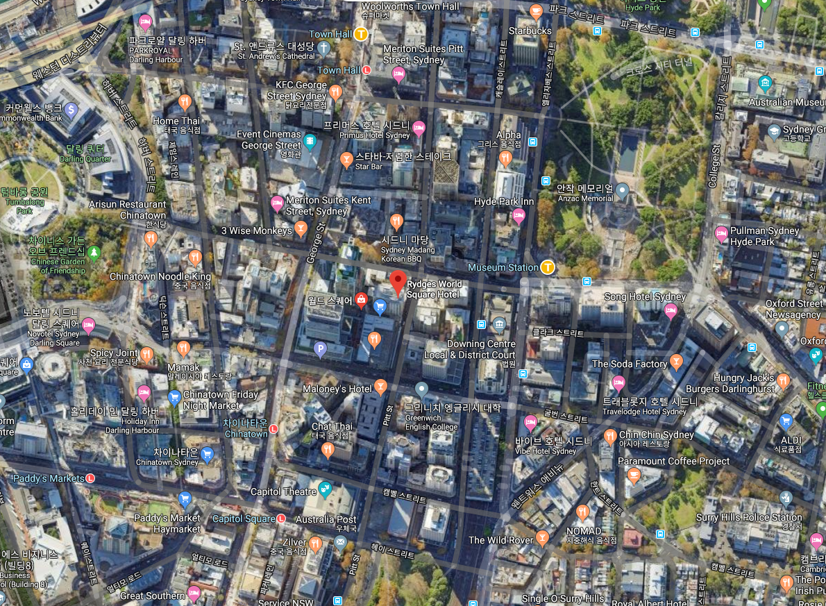 시드니호텔 리지스 월드 스퀘어 (Rydges World Square)는 월드 쇼핑 및 비즈니스 구역에 도보로 가능한 위치에 자리하고 있으며 시드니의 여러 관광명소를 여행하는 데에 편리합니다. 호텔 인근에 모노레일이 운행되고 있어 달링 하버, 시드니 컨벤션&익시비션 센터 및 시드니 수족관 등으로 편리하게 이동 가능합니다.