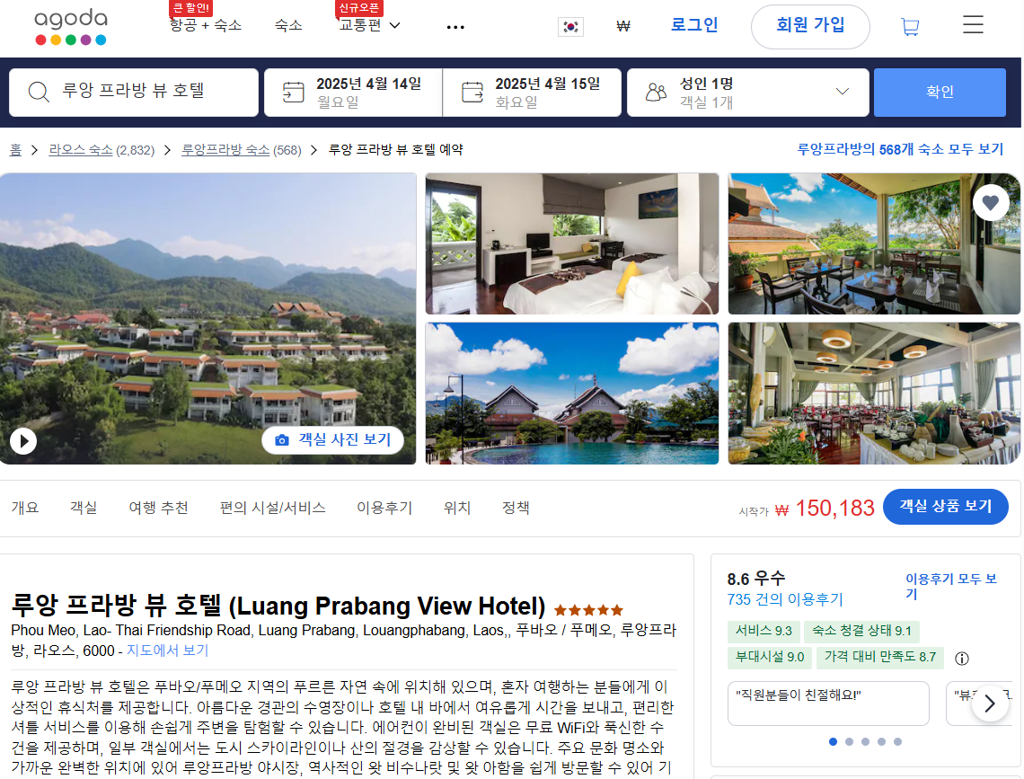 루앙프라방 뷰 호텔 (Luang Prabang View Hotel)의 최저 가격대는 아고다에서 할인특가 가격으로 매일매일 변동되며 10만원대부터 다양하게 형성됩니다.아고다 최저가를 확인하시려면 아래 링크를 누르시면 원하는 날짜의 가격대를 자세히 보실 수 있습니다.