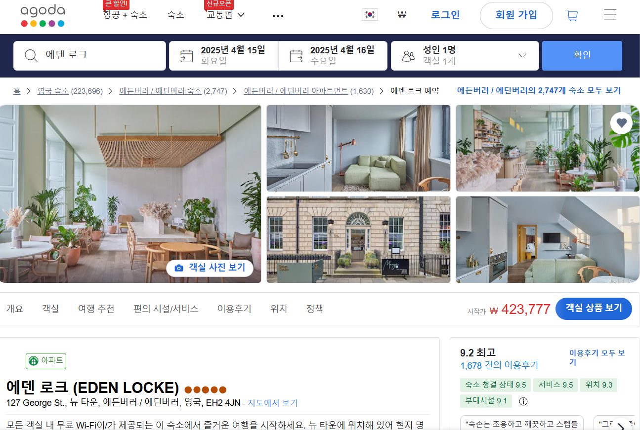 에든버러호텔 에덴 로크 (EDEN LOCKE)의 최저 가격대는 아고다에서 할인특가 가격으로 매일매일 변동되며 평균 40 ~ 50만원대부터 다양하게 형성됩니다. 아고다 최저가를 확인하시려면 아래 링크를 누르시면 원하는 날짜의 가격대를 자세히 보실 수 있습니다.
