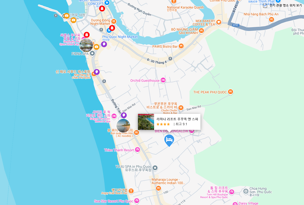 푸꾸옥의 10만원대에 가성비 좋은 라하나 리조트 푸꾸옥 앤 스파 (Lahana Resort Phu Quoc & Spa)는 푸꾸옥의 여행자 거리 인근의 자연친화적인 아름다운 리조트로 야시장에서 도보로 15분에서 20분정도 소요되고, 택시타면 한 2000원정도 지불하면 됩니다. 주변에도 식당들이 많이 있어 저렴한 푸꾸옥여행을 원하시는 분들께 최고의 위치, 가격 대의 푸꾸옥리조트입니다.