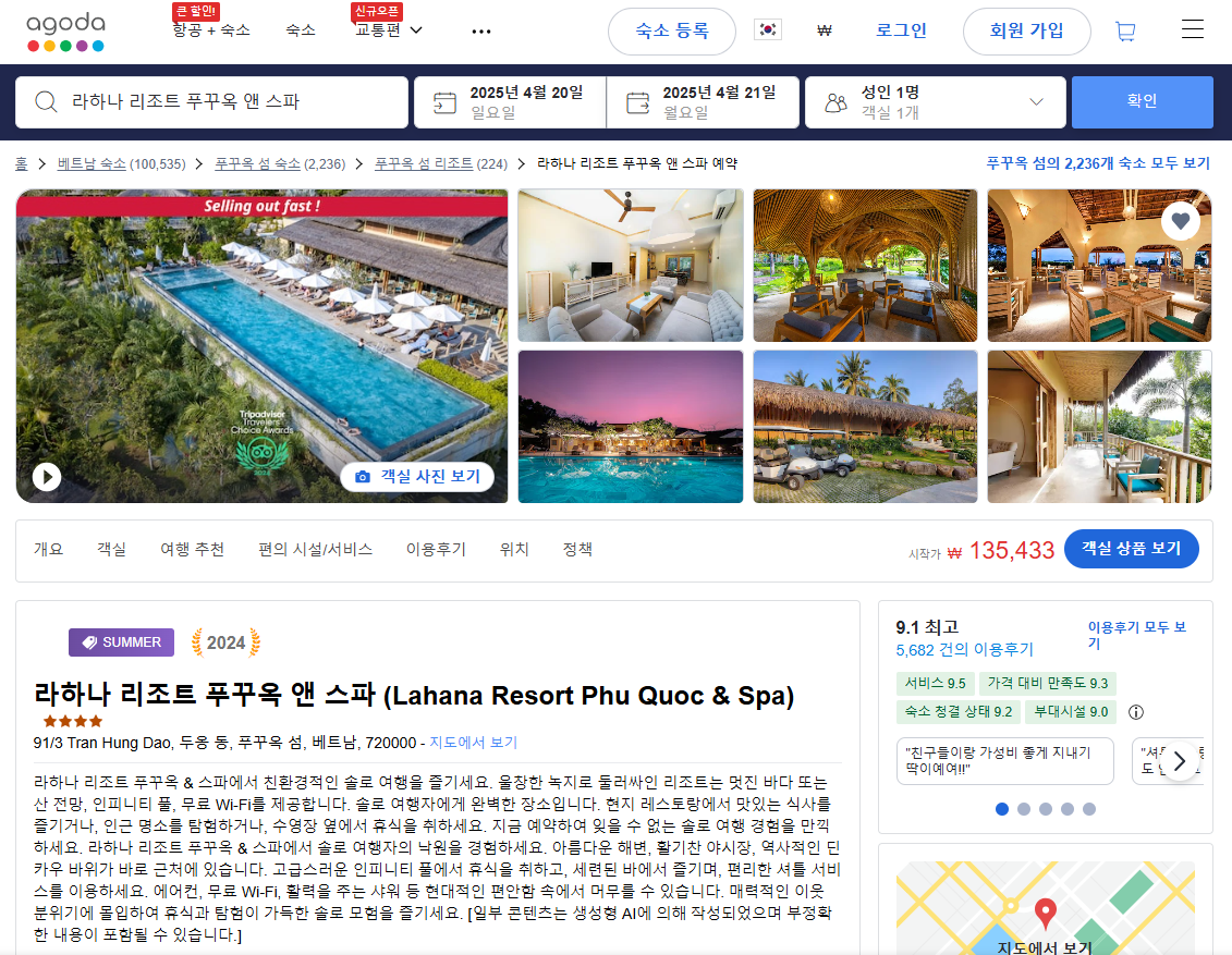 라하나 리조트 푸꾸옥 앤 스파 (Lahana Resort Phu Quoc & Spa)의 최저 가격대는 아고다에서 할인특가 가격으로 매일매일 변동되며 평균 10만원대부터 다양하게 형성됩니다. 아고다 최저가를 확인하시려면 아래 링크를 누르시면 원하는 날짜의 가격대를 자세히 보실 수 있습니다.