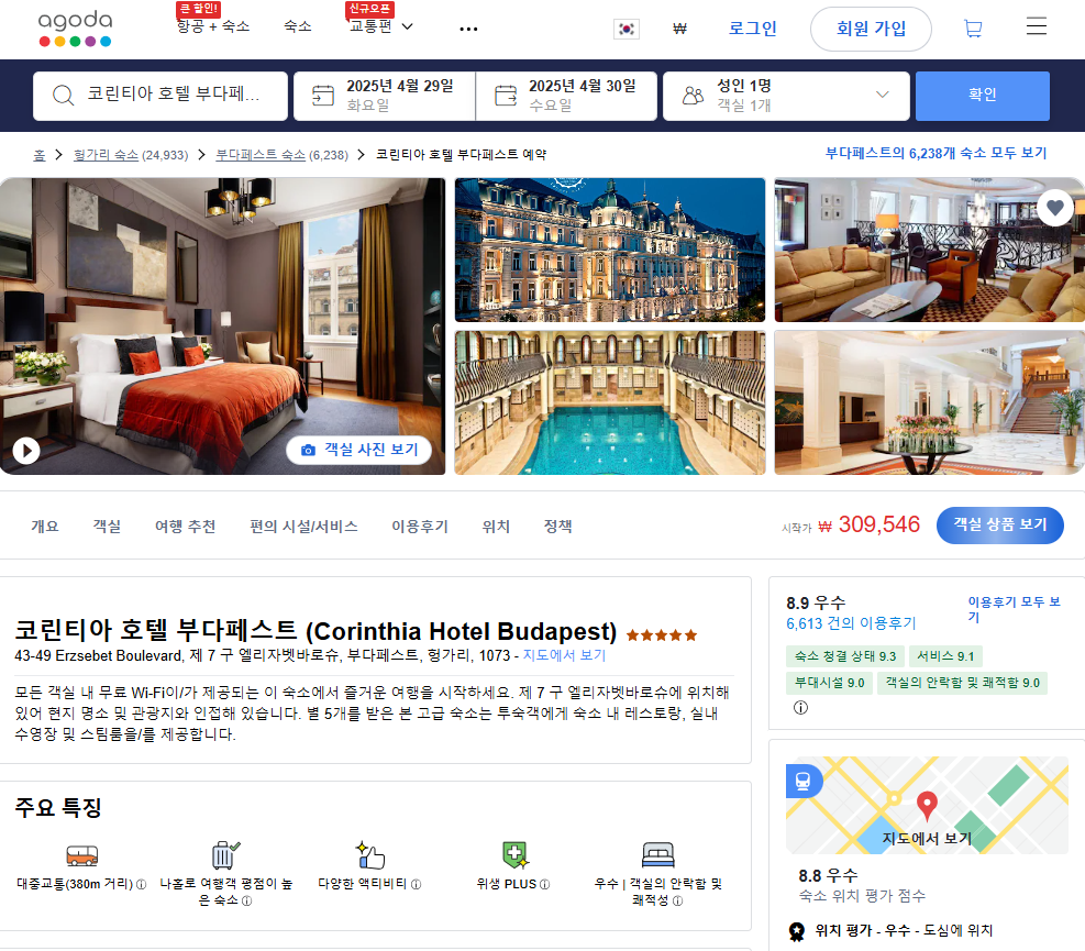 코린티아 호텔 부다페스트 (Corinthia Hotel Budapest)의 1박당 요금 최저 가격대(세금 및 봉사료 포함)는 아고다웹사이트에서 할인특가 가격으로 매일매일 변동되며 10만원대부터 다양하게 형성됩니다. 날짜별로 매일 가격이 다르므로 아고다웹사이트 최저가를 확인하시려면 아래 링크를 누르시고 원하는 날짜의 가격대를 선택해야 정확한 가격을 자세히 보실 수 있습니다.