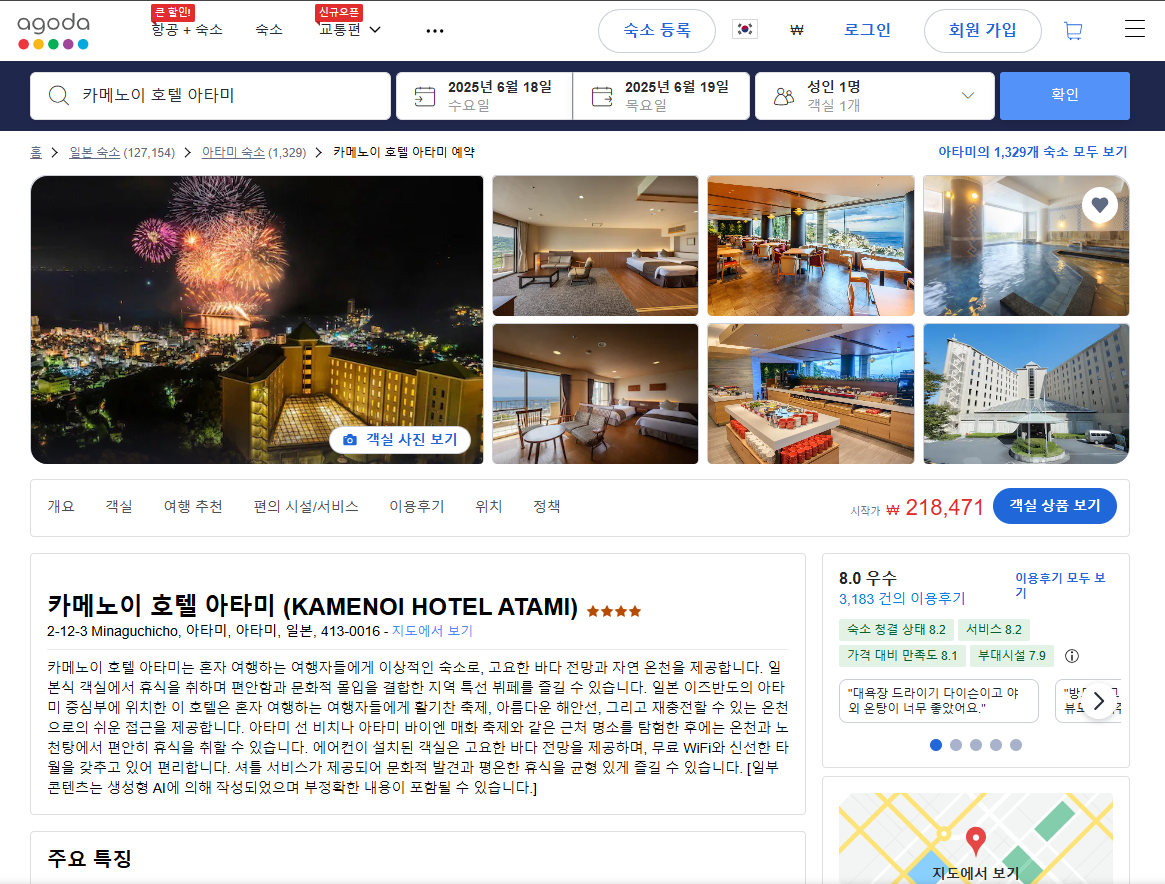 카메노이 호텔 아타미 (KAMENOI HOTEL ATAMI)의 최저 가격대는 아고다웹사이트에서 할인특가 가격으로 매일매일 변동되며 10만원대부터 다양하게 형성됩니다. 날짜별로 매일 가격이 다르므로 아고다웹사이트 최저가를 확인하시려면 아래 링크를 누르시고 원하는 날짜의 가격대를 선택해야 정확한 가격을 자세히 보실 수 있습니다.