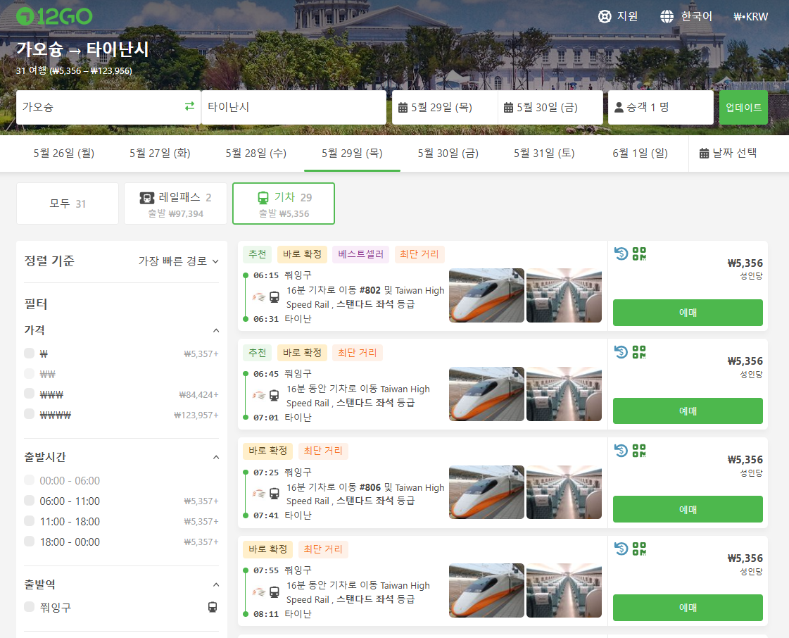 가유슝에서 타이난으로 이동하는 기차 교통편