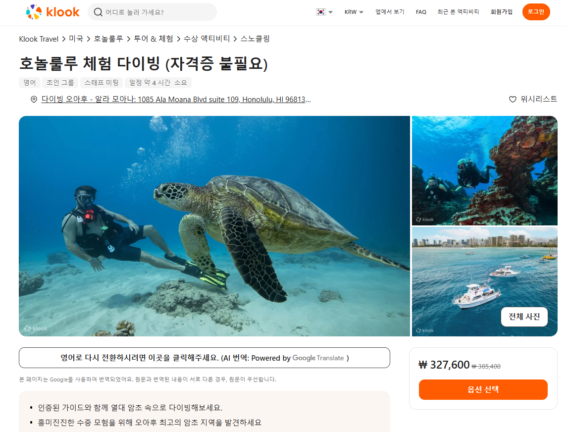 호놀룰루 체험 다이빙은 클룩사이트에서 쉽게 예약하실 수 있으며, 이메일, 전화번호, 카카오톡, 네이버, 구글, 애플, 페이스복 등으로 간편하게 회원가입하고 이용하실 수 있습니다. 요금 및 일정, 포함사항은 변동될 수 있으므로 예약시 다시 확인하고 이용하세요~