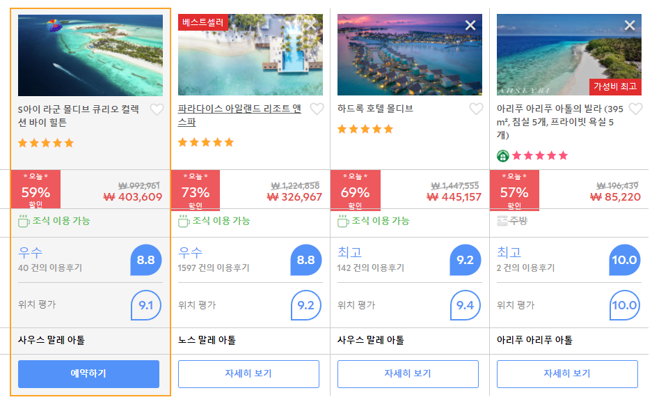 S아이 라군 몰디브 큐리오 컬렉션 바이 힐튼의 최저 가격대는 아고다에서 할인특가 가격으로 매일매일 변동되며 10만원대부터 다양하게 형성됩니다. 날짜별로 매일 가격이 다르므로 아고다 최저가를 확인하시려면 아래 링크를 누르시고 원하는 날짜의 가격대를 선택해야 정확한 가격을 자세히 보실 수 있습니다.
