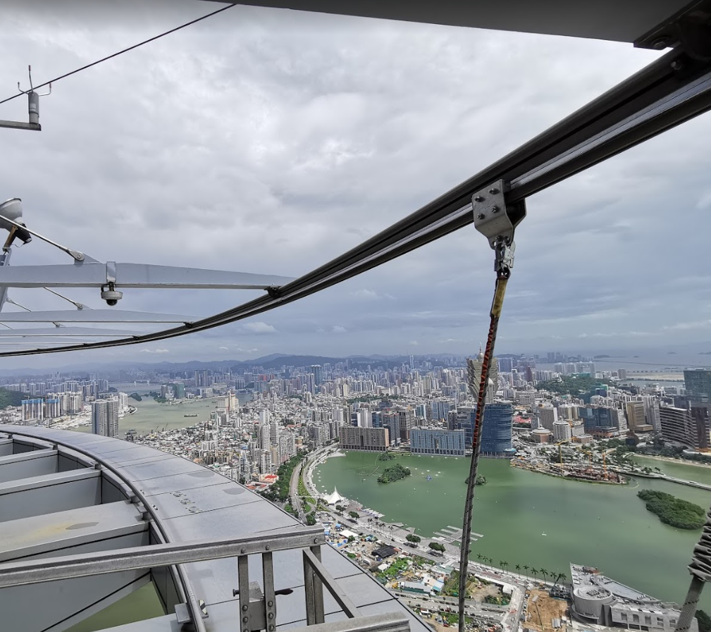 마카오와 중국 본토의 놀라운 장관을 직접 눈으로 볼 수 있는 마카오타워 스카이워크는 타워의 고층에서 머리 위로 연결되어 있는 벨트 장치에 의지해 15~20 분 동안 걸어보는