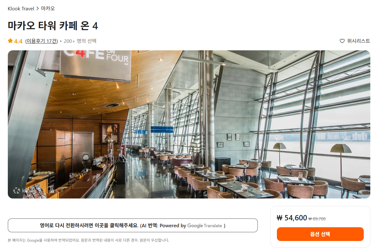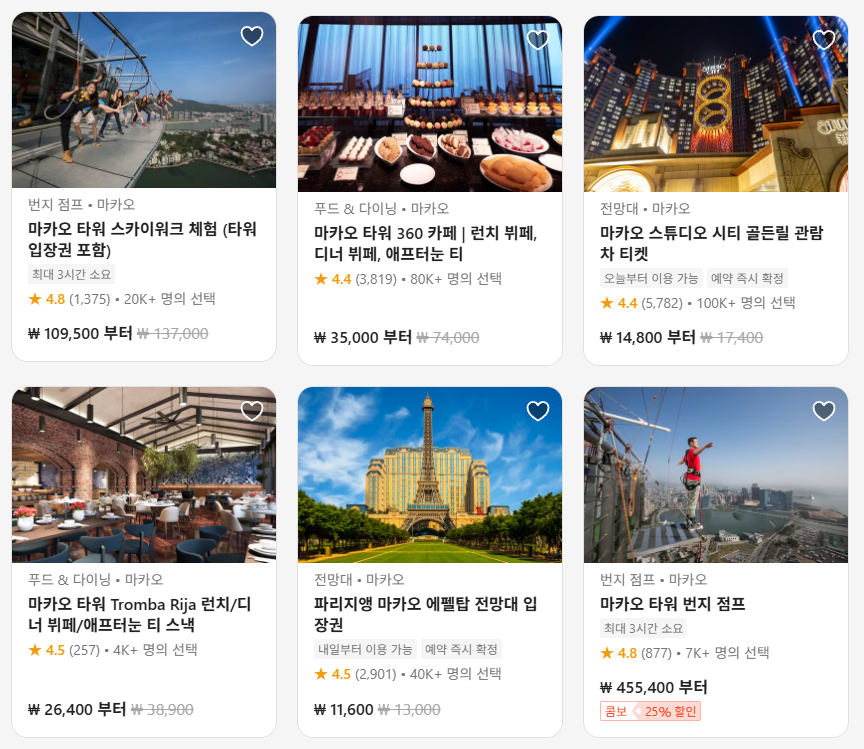 마카오타워 입장권은 클룩사이트에서 쉽게 예약하실 수 있으며, 이메일, 전화번호, 카카오톡, 네이버, 구글, 애플, 페이스복 등으로 간편하게 회원가입하고 이용하실 수 있습니다. 요금 및 일정, 포함사항은 변동될 수 있으므로 예약시 다시 확인하고 이용하세요~