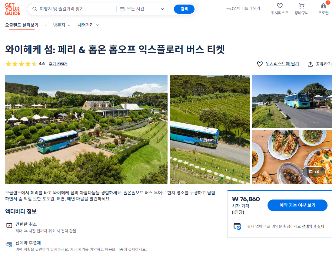 오클랜드에서 와이헤케섬으로 이동하는 페리와 섬투어버스 교통편 패키지는 GET YOUR GUIDE 사이트에서 예약하실 수 있습니다. 사이트는 특히 전세계 대부분의 나라, 지역의 투어, 교통편 있어, 쉽게 찾을 수 없는 여행지의 다양한 투어 및 서비스를 이용할 수 있는 글로벌 사이트입니다. 전세계 여행자들이 많이 사용하는 사이트로 한국분들이 많이 예약하는 투어를 찾으신다면 klook 여행사이트 추천합니다. 함께 사용하시면 더욱 편하게 여행하실 수 있습니다.