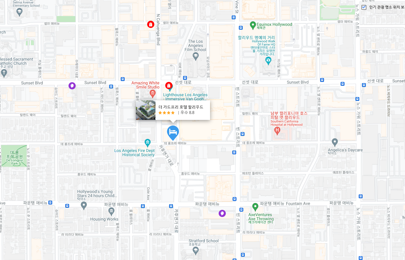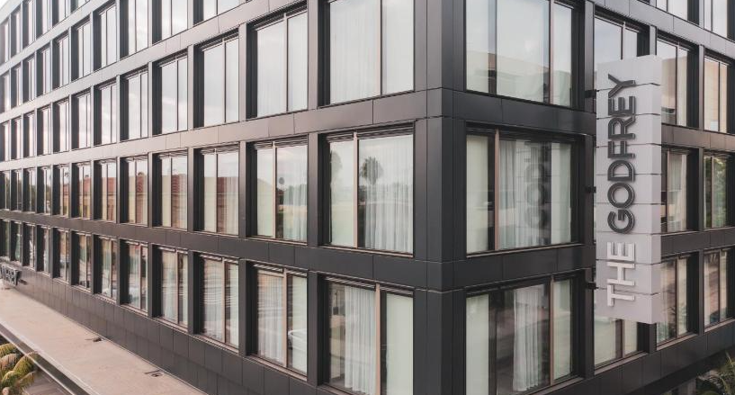 LA 할리우드의 최신호텔로 유니버설 스튜디오, 그리피스 천문대, Waner Bros 스튜디오와 가까운 더 가드프리 호텔 할리우드 (The Godfrey Hotel Hollywood)는 최근 오픈한 호텔인 만큼 시설좋고 쾌적하게 지내기 좋은 인기만점호텔로 주변에 레스토랑과 커피 숍과 매우 가깝고 밤낮으로 걸어 다니는 것이 안전하다고 느낄 수 있는 곳에 위치하고 있습니다.