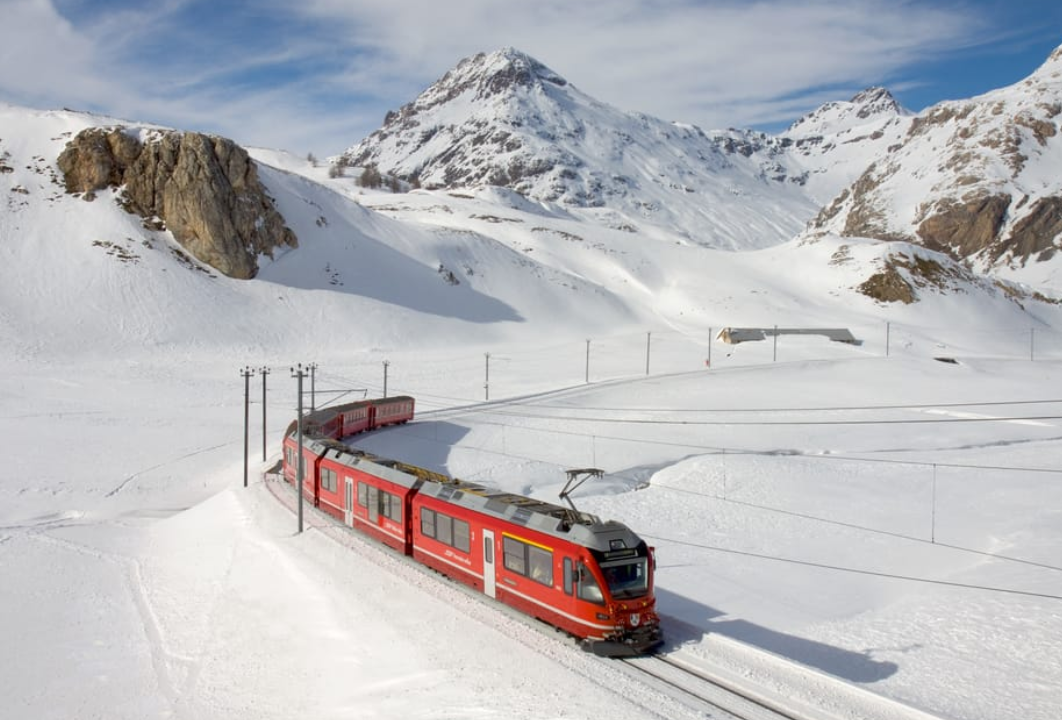 빨간색 베르니나 특급열차를 타고 스위스 알프스의 눈부신 풍경을 가로지르는 멋진 여행을 떠나세요. 알프스에서 가장 높은 철도를 달리는 베르니나 급행열차는 해발 2,256m의 반짝이는 빙하까지 올라갑니다. 멋진 경관을 사진에 담아보세요.