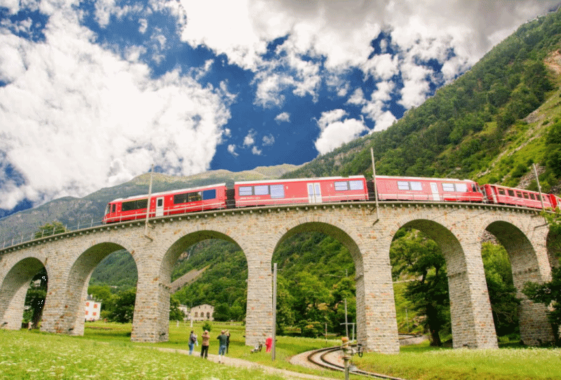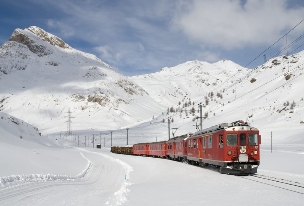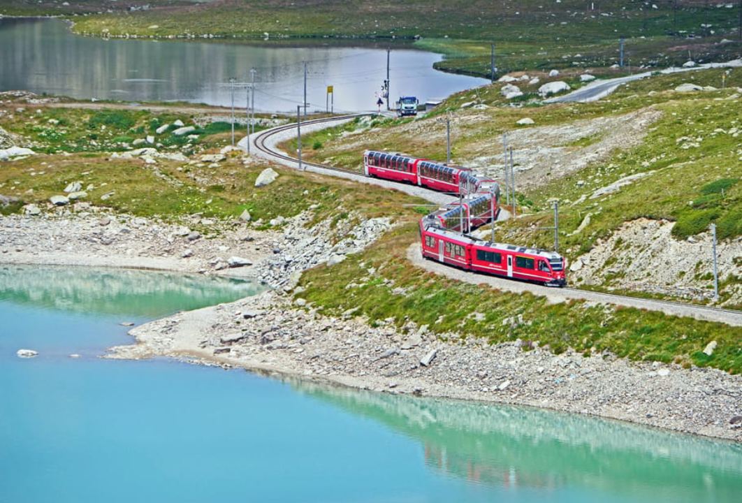 밀라노여행에 빨간색 파노라마 베르니나 열차를 타고 스위스 알프스의 환상적인 풍경을 가로지르는 멋진 여행을 떠나, 생모리츠의 럭셔리 리조트까지 기차를 타고 아름다운 절경을 즐겨보세요.
