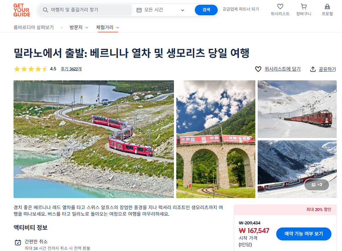 밀라노출발 베르니나 열차와 생모리츠 종일투어는 GET YOUR GUIDE 사이트에서 예약하실 수 있습니다. 사이트는 특히 전세계 대부분의 나라, 지역의 투어, 교통편 있어, 쉽게 찾을 수 없는 여행지의 다양한 투어 및 서비스를 이용할 수 있는 글로벌 사이트입니다. 전세계 여행자들이 많이 사용하는 사이트로 한국분들이 많이 예약하는 투어를 찾으신다면 klook 여행사이트 추천합니다. 함께 사용하시면 더욱 편하게 여행하실 수 있습니다.