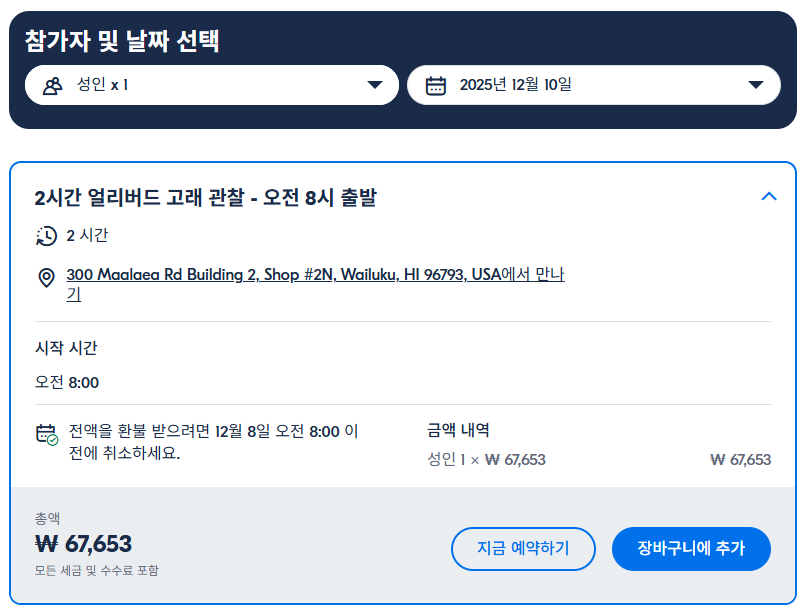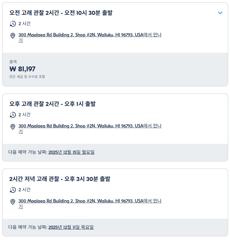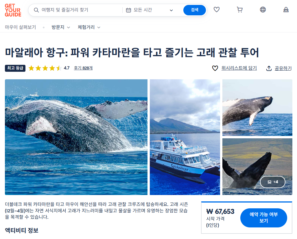 마우이 고래관람크루즈는 GET YOUR GUIDE 사이트에서 예약하실 수 있습니다. 사이트는 특히 전세계 대부분의 나라, 지역의 투어, 교통편 있어, 쉽게 찾을 수 없는 여행지의 다양한 투어 및 서비스를 이용할 수 있는 글로벌 사이트입니다. 전세계 여행자들이 많이 사용하는 사이트로 한국분들이 많이 예약하는 투어를 찾으신다면 klook 여행사이트 추천합니다. 함께 사용하시면 더욱 편하게 여행하실 수 있습니다.