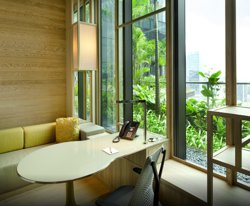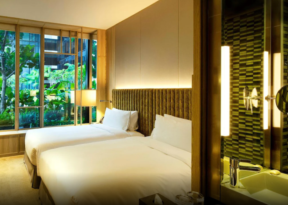 이곳은 '정원 오아시스'라는 별명처럼 건물 자체가 푸르른 녹지로 뒤덮여 있어요. 호텔 안으로 들어서면 복도나 공용 공간에서도 자연 채광과 신선한 공기를 느낄 수 있도록 설계되어 있어서, 실내에 있는데도 마치 숲속을 산책하는 듯한 기분이 들곤 합니다. 이런 디자인 덕분에 싱가포르의 뜨거운 햇살 아래서도 시원하고 쾌적하게 호텔 곳곳을 누빌 수 있죠. 환경을 생각하는 마음도 곳곳에서 느껴지는데, 예를 들어 객실에 플라스틱 생수병 대신 정수 수전이 설치되어 있는 점도 인상 깊어요.