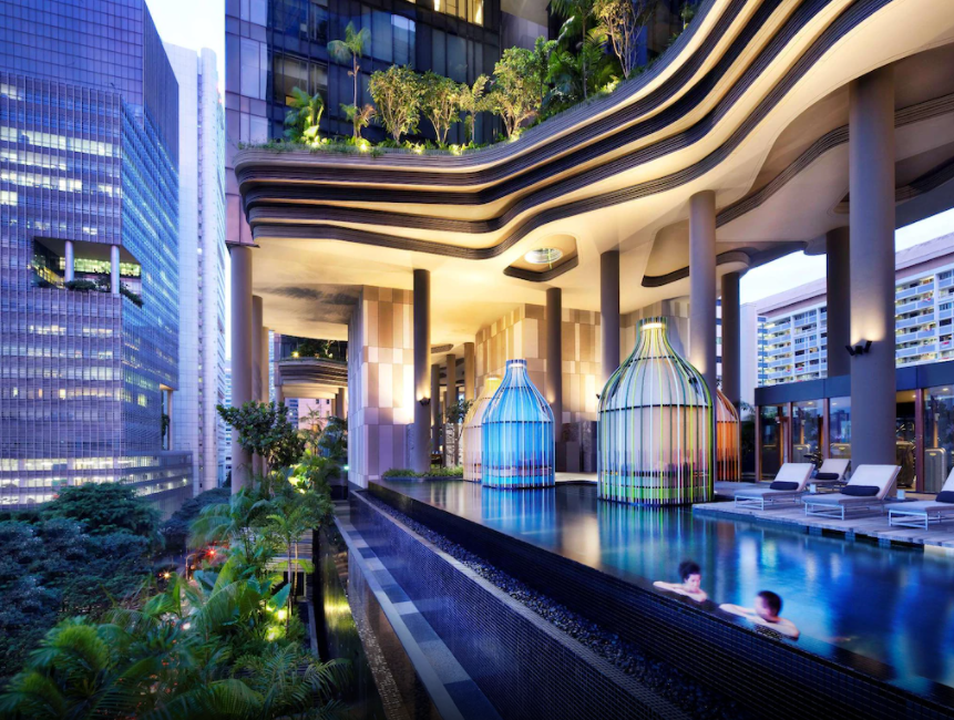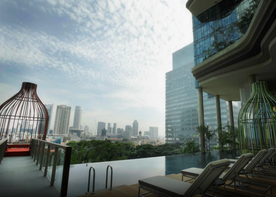 호텔의 하이라이트 중 하나는 바로 옥상에 있는 수영장이에요. 푸른 나무와 식물들 사이에서 수영을 즐기거나 선베드에 누워 있으면, 아래로 펼쳐지는 싱가포르 도심의 멋진 풍경이 한눈에 들어옵니다. 낮에는 활기찬 도시의 모습을, 밤에는 반짝이는 야경을 감상하며 여유로운 시간을 보낼 수 있어요.
