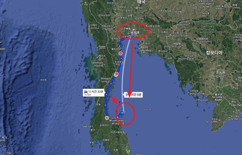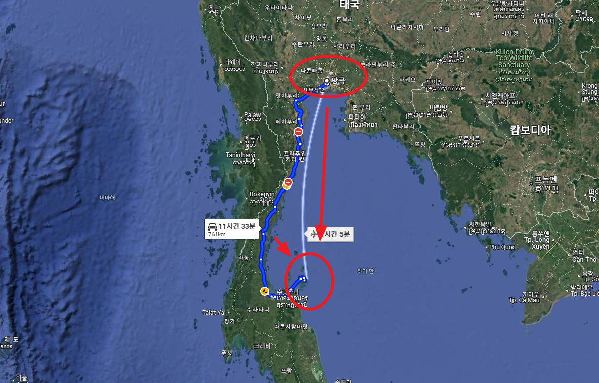 동남아시아자유여행의 성지 여행의 시작과 끝으로 유명한 방콕에서 코사무이까지의 거리는 어떤 교통수단을 이용하시느냐에 따라 조금씩 달라진답니다.